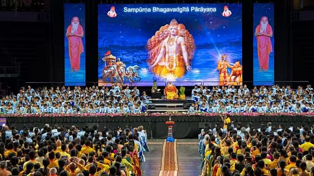 Guru Purnima 2023: गुरुपौर्णिमेच्या शुभ मुहूर्तावर अमेरिकेतील टेक्सास येथील अॅलन ईस्ट सेंटरमध्ये एक विशेष घटना घडली. 750 हून अधिक मंत्रोच्चारांनी भगवद्गीतेचे सामूहिक पठण करण्यासाठी सुमारे दहा हजार लोकांनी हजेरी लावली.