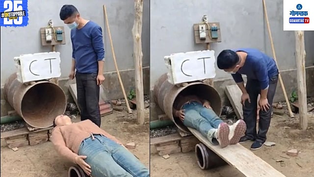 व्हिडिओमध्ये तुम्ही पाहू शकता की, तरुणाने एका ड्रमला (Drum) आडवे ठेवले आहे आणि स्ट्रेचरऐवजी लाकडी फळीचा (Wooden Plank) वापर केला आहे. त्याच फळीवर तरुणी रुग्ण बनून आपला सीटी स्कॅन करण्यासाठी येऊन झोपते. त्यानंतर स्ट्रेचर म्हणजेच लाकडी फळी हळूच ड्रमच्या दिशेने सरकते आणि सीटी स्कॅनची प्रक्रिया पूर्ण होते.