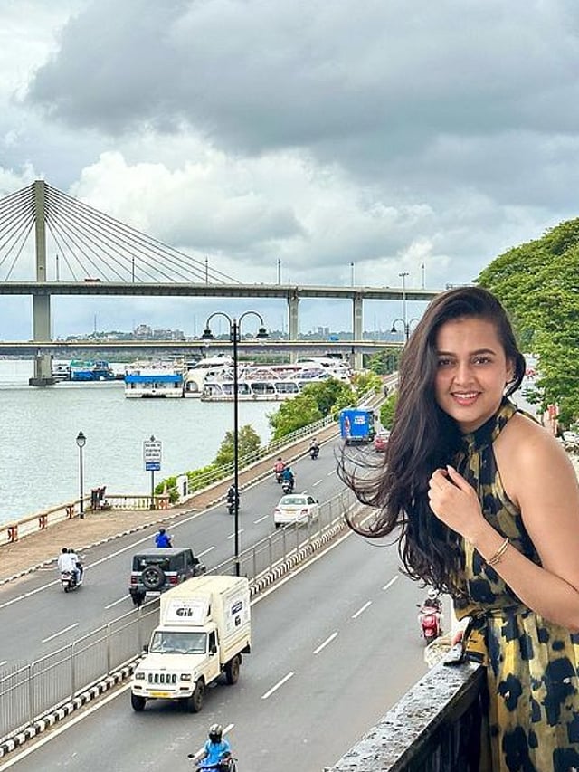 तेजस्वी प्रकाश इमारतीच्या बाल्कनीतून बाहेर पाहत आहे, तिच्यासमोर मांडवी नदीचे पात्र आणि मागे अटल सेतू दिसत आहे.