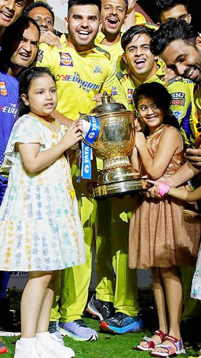 दरम्यान, नंतर चेन्नईच्या खेळाडूंनी विजेतेपदाची ट्रॉफी संघाचा कर्णधार एमएस धोनीची मुलगी झिवा, रविंद्र जडेजाची मुलगी निध्याना, अजिंक्य रहाणेची मुलगी आर्या यांच्या हातात दिली.