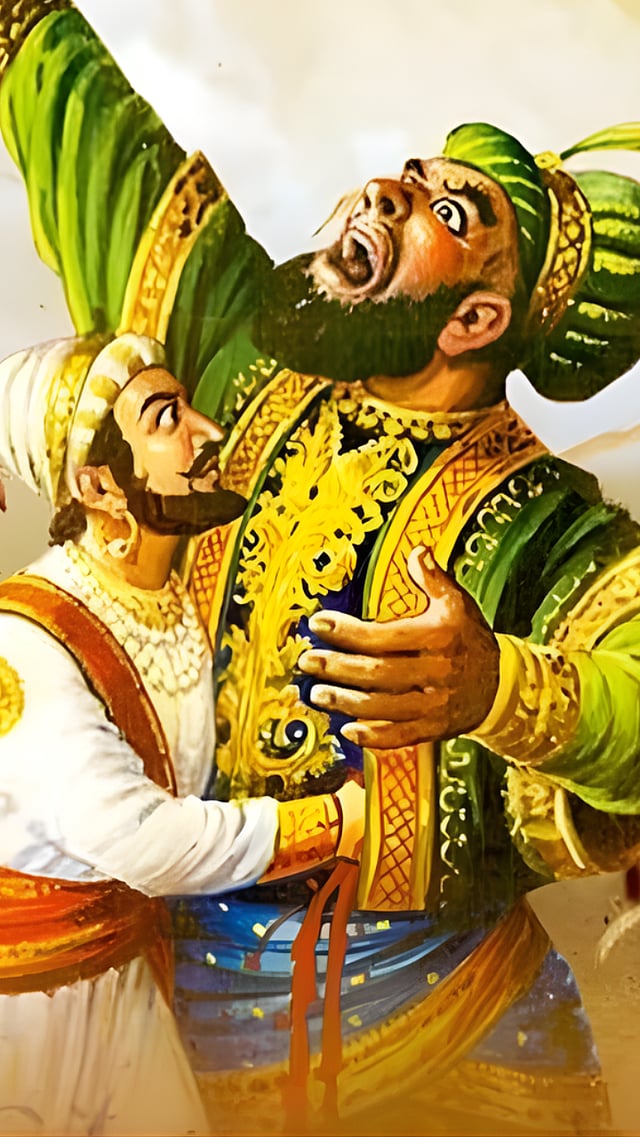 शिवाजी महाराजांनी प्रतापगडावर अफजलखानाला भेटण्याचे आमंत्रण दिले. या भेटीत अफजलखानाने कपटाने महाराजांना मिठी मारून हल्ला करण्याचा प्रयत्न केला.