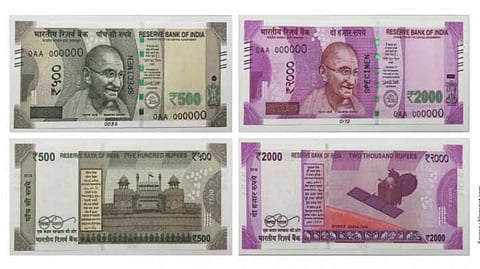12. उजव्या बाजूला 500 लिहिलेले वर्तुळ बॉक्स, उजव्या आणि डाव्या बाजूला 5 ब्लीड रेषा आणि अशोक स्तंभाचे प्रतीक, रफल प्रिंटमध्ये महात्मा गांधींचे चित्र.