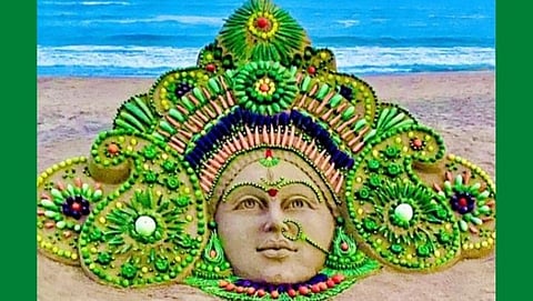 भारतात दरवर्षी नवरात्रोत्सव (Navaratri) साजरा केला जातो. गेल्या 2 वर्षांपासून, कोरोनामुळे, त्याची लोकप्रियता थोडी कमी झाली आहे. यावर्षीही नवरात्रीमध्ये अनेक ठिकाणी जत्रेचे आयोजन करण्यात आले नव्हते. काही ठिकाणी फक्त माता राणीची मूर्ती बसवण्यात आली. अशा परिस्थितीत या मूर्ती विशेष असाव्यात असा प्रयत्न करण्यात आला. अशीच एक मूर्ती एका खास कारणामुळे सोशल मीडियावर प्रसिद्धीझोतात आली. माता राणीची ही मूर्ती वाळूवर कोरलेली होती. याशिवाय मूर्ती बनवण्यासाठी 12 प्रकारच्या भाज्यांचा वापर केला गेला.
