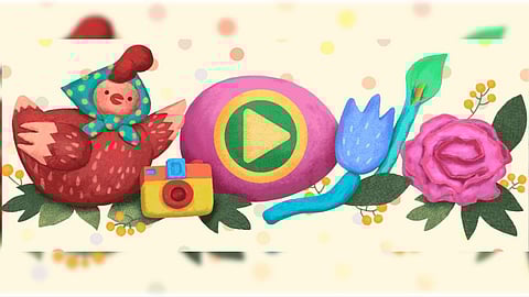 Google च्या मदर्स डे (Google Doodle) च्या पार्श्वभूमीवर, एक कोंबडी तिच्या अंड्याची काळजी घेते, एक संरक्षणात्मक, पालनपोषण प्रतीक आहे. जे सर्व माता करतात.