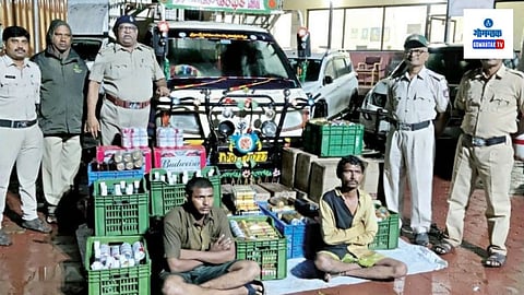 Goa-made liquor allegedly smuggled : गोवा बनावटीच्या मद्याची आंध्र प्रदेशमध्ये बेकायदा वाहतूक करणाऱ्या दोघा संशयितांना कर्नाटकच्या अबकारी खात्याने अटक केली आहे. याप्रकरणी दोघांवर गुन्हा दाखल केला असून वाहन जप्त करण्यात आले. या कारवाईत एकूण 7 लाखांचे मद्य जप्त करण्यात आले आहे.