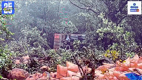 वाळपई: चोर्लाघाटात मंगळवारी सकाळी साडेसहाच्या सुमारास दरड कोसळून झालेल्या दुर्घटनेत सिमेंट वाहून नेणारा ट्रक खोल दरीत कोसळला. दरड कोसळल्याने रस्त्यावरील माती, झाड व पाण्यामुळे ट्रकवरील चालकाचा ताबा सुटल्याने ही दुर्घटना घडली. सुदैवाने प्रसंगावधान राखून चालकाने वेळीच ट्रकमधून उडी घेतल्याने तो थोडक्यात बचावला.