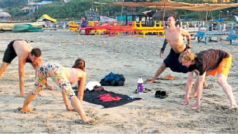 Goa Tourism: देश-विदेशातील पर्यटक गोव्याच्या समुद्रकिनारी भागात पर्यटनाचा आनंद लुटण्यासाठी येत असतात. मात्र काही पर्यटक पर्यटनाचा आनंद घेण्याबरोबरच आपले जीवन, आरोग्य निरोगी व निरामय राहण्यासाठी किनारी भागात पहाटेच्या वेळी योगासने करताना दिसतात.