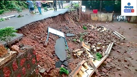 रस्त्यावर पाणी तुंबून राहिल्याने ही चिऱ्यांनी बांधलेली भिंत कोसळली. शांतादुर्गा देवस्थानची ही जागा असून काँक्रिटने ही भिंत बांधण्यात येईल, असे सार्वजनिक बांधकाम खात्याच्या अधिकाऱ्यांनी सांगितले.