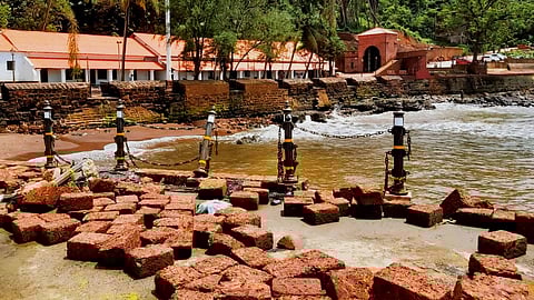 गोवा पर्यटन विकास महामंडळाच्या (Goa Tourism Development Corporation) स्वदेश दर्शन योजनेखाली सुशोभिकरण करण्यात आलेल्या पुरातन आग्वाद तुरुंगाच्या (Aguad Jail) समोरचा चिरेबंदी कुंपणाचा काही हिस्सा तसेच सुशोभिकरणासाठी वापरण्यात येत असलेले चिरे आणी इतर बांधकाम साहित्य पावसाच्या तडाख्यामुळे वाहून गेल्याची माहिती स्थांनिकांकडून मिळाली. दरम्यान, अंदाजे बावीस कोटी रुपये खर्च (22 Crore) करून सुशोभीकरणाचे काम करण्यात येत असलेल्या येथील तुरुंगाचे सध्या वस्तू संग्रहालयात (Museum) रुपांतर करण्यात आलेले आहे. (Goa)