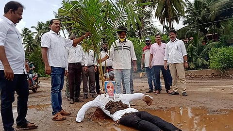 पेडणे: राष्ट्रीय महामार्गावर (National highway) पडलेल्या भल्यामोठ्या खड्ड्यांकडे सरकारचे लक्ष वेधण्यासाठी पेडणे मगो पक्षातर्फे मालपे येथे आगळ्यावेगळ्या पद्धतीने आंदोलन करण्यात आले. यावेळी विडंबनात्मक भजन सादर करुन, खड्ड्यांत कवाथे लावून तसेच उपमुख्यमंत्री (Deputy Chirf Minister) बाबू आजगावकर (Babu Ajgaonkar) यांच्या पुतळ्याचे खड्ड्यातच दहन करून त्यांचा व सरकारचा निषेध करण्यात आला. पेडणे मतदारसंघातील महाखाजन ते पत्रादेवीपर्यंतच्या (Mahakhajn to Patradevi) राष्ट्रीय महामार्गाची अक्षरश: चाळण झाली असून वाहतूक करताना वाहनचालकांना कसरत करावी लागत आहे. अपघात वाढले असून, अनेकांना प्राणही गमवावे लागले आहे. या खड्डयांमध्ये पावसाचे पाणी साचत असून तलावाचे स्वरूप प्राप्त झाले आहे. बाबू आजगावकर यांच्यावर विडंबनात्मक भजन सादर करून तसेच गाऱ्हाणे घालून निषेध करण्यात आला.