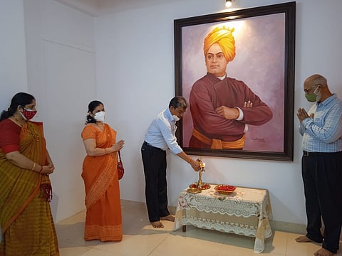 रवीन्द्र भवन मडगाव येथील स्वामी विवेकानंद केंद्राच्या दालनात समई प्रज्वलित करुन त्यांच्या फोटोला फुले अर्पण केली.