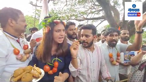 युवक काँग्रेसच्या वतीने मंगळवारी दुपारी आझाद मैदानावर निदर्शने करण्यात आली. यावेळी काँग्रेस कार्यकर्त्यांनी टोमॅटो, कांदा, मिरची यांचे हार गळ्यात घातले होते, काहींनी ते हार डोक्यावर बांधले होते.