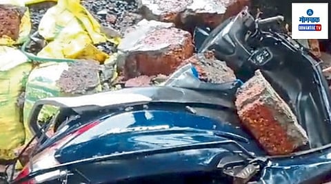 एका बांधकाम कंत्राटदाराने उभारलेली कुंपणााची भिंत काल कोसळल्याने दुसऱ्या घराचे नुकसान झाले. या भिंतीच्या दगडाखाली एक दुचाकी सापडल्याने त्या दुचाकीचीही मोडतोड झाली.