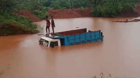 केपे : मिराबाग सावर्डे येथे बऱ्याच बेकायदेशीर चिरे काढण्याचा व्यवसाय चालतो या साठी कोणती ही शासकिय यंत्रणा, पर्यावरण विभाग यांची परवानगी नाही. केवळ व्यक्तीगत अर्थिक हीताने काही व्यक्ती यासाठी असे मार्ग अवलंबत आहेत. या पार्श्वभूमीवर आज दुपारी चिरे नेण्यासाठी आलेला ट्रक चिरे भरताना अचानक पाणी आल्याने पाण्याखाली गेला. ( Illegal laterite stone truck stuck Mirabagh Sanvordem )