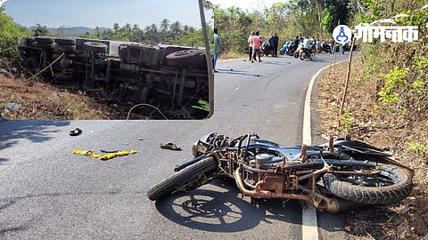 भरधाव ट्रकने सांगे कोठार्ली येथे दुचाकीला मागून धडक दिली. या धडकेत दुचाकीचा तोल गेल्याने दुचाकीस्वार व दुचाकीवर बसलेली मागील व्यक्ती रस्त्यावर पडले. यावेळी त्यांच्या अंगावरुन ट्रक गेल्याने चिरडले गेले. भरधाव ट्रक चालकाचे वाहनावरील नियंत्रण सुटल्याने ट्रक रस्त्याच्या कडेला पलटी झाला.