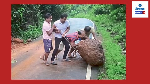 रमाकांत कालेकर, आकाश ओमलकर, मनोज कालेकर व विराज गावकर या युवकांना हा दगड रस्त्यावरून हटवला. दरडी कोसळत असल्यामुळे सध्या हा रस्ता वाहतुकीसाठी धोकादायक झाला आहे.