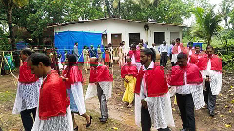 ख्रिस्ती कपेल समोर क्रॉस आणि तुळशी वृंदावन एकाच ठिकाणी