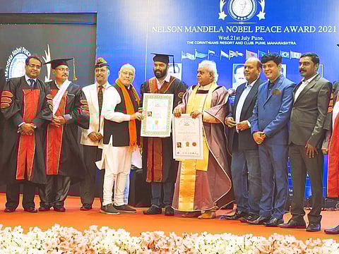 पुणे (Pune) येथे नुकत्याच संपन्न झालेल्या कार्यक्रमात नेल्सन मंडेला नोबेल पिस अवॉर्ड (Nelson Mandela Nobel Peace Award) अकादमीचे चेअरमन डॉ. राजकुमार टाक व पंतप्रधान नरेंद्र मोदी यांचे बंधू श्री प्रल्हाद दामोदरदास मोदी (Brother of Narendra Modi) यांच्या हस्ते श्री सिद्धेश श्रीपाद नाईक (son of Central Minister Shripad Naik) यांना हा पुरस्कार प्रदान करण्यात आला. यावेळी American University of Global Peace या विद्यापीठाची मानद डॉक्टरेट पदवीही सिद्धेश नाईक यांना सन्मानपूर्वक प्रदान करण्यात आली. या प्रसंगी प्रमुख पाहुणे म्हणून पंतप्रधान नरेंद्र मोदी यांचे बंधू श्री. प्रल्हाद दामोदरदास मोदी, अमेरिकन युनिव्हर्सिटी ऑफ ग्लोबल पिस विद्यापीठाचे कुलगुरू डॉ. मधुकृष्णन व बॉस्नियाचे राजदूत सुहास मंत्री, नेल्सन मंडेला नोबेल पिस अवॉर्ड अकादमीचे चेअरमन डॉ.राजकुमार टाक, उपाध्यक्ष डॉ. विजय सिंह पाटील, सेक्रेटरी जोशुआ इमान्यल व मान्यवर उपस्थित होते.