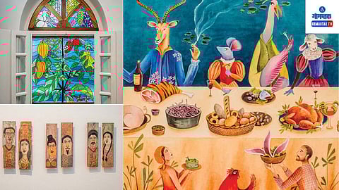 आशिष फळदेसाई यांच्या जलरंगातून निर्माण झालेल्या चित्रांमधून गोव्याच्या निर्मळ खजान प्रदेशांचे पर्यावरणीय महत्त्व आपल्या लक्षात येते. केग डिसौजा आपल्या स्टेन्ड ग्लास कलाकृतीतून चर्चच्या खिडक्यांवरची आकर्षक जैवविविधता जिवंत करतो. आसावरी गुरव यांचे उल्लेखनीय 'नोट्स इन टाईम', सतीची प्राचीन परंपरा आणि त्यातील त्यागाची संकल्पना मांडते.'द वेडिंग एट हार्मुझ- टर्निंग वॉटर इंटू स्लाईटली वॉर्मर वॉटर' हे ससा आणि कोल्ह्याचे विलक्षण मिलन दर्शवते.