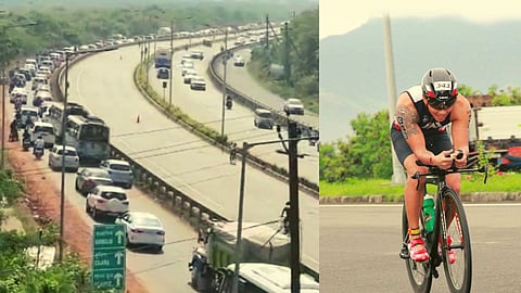 Traffic Jam in Panaji : गोव्यात आंतराष्ट्रीय दर्जाच्या Ironman 70.3 या ट्रायथलॉन स्पर्धेची आज सुरुवात झाली आहे. या पार्श्वभूमीवर आज शहरातील वाहतुकीमध्ये अनेक बदल करण्यात आले आहेत. स्पर्धेसाठी वाहतूक वळवल्यामुळे पणजीत आणि जवळपासच्या भागात मोठ्या प्रमाणात वाहतूक कोंडी झाली आहे. (Ironman 70.3 in Goa)