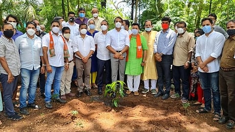 पणजीः डॉ. श्यामाप्रसाद मुखर्जी यांच्या जयंतीनिमित्त कांपाल पणजी येथे रोपटे लावून त्याला पाणी घालताना केंद्रीय मंत्री श्रीपाद नाईक. सोबत सुनील देवधर, आमदार बाबूश मोन्सेरात, महापौर रोहित मोन्सेरात व इतर. (Tree was planted on the occasion of Dr. Shyamaprasad Mukherjee's birthday)