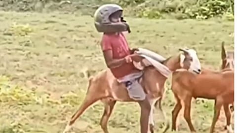 व्हायरल होत असलेल्या या व्हिडीओमध्ये तुम्ही बघू शकता की रिकाम्या शेतात हेल्मेट घातलेला मुलगा बकरीवर बसला आहे आणि बकरीही मजेने चालत आहे. जसे लोक घोड्यावर बसतात तसे हा मुलगा हेल्मेट घालून बसला आहे. मुलाची स्टाईल पाहता तो घोड्यावर स्वार आहे असे दिसते. याशिवाय, मुलाने बकरीच्या गळ्यात एक कापड पकडून तिच्या दोन्ही टोके आपल्या हातांनी धरली आहेत. पण काही अंतर गेल्यावर तुम्हाला दिसेल की मुलाचा पाय जमिनीवर अडकला आणि तो खाली पडला.