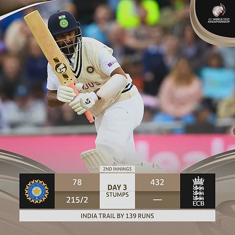 त्यानंतर आलेला फलंदाज व भारताचा कर्णधार विराट कोहलीने (Captain Virat Kohli) स्थिरावलेल्या पुजाराला अनुकूल साथ दिली, व धावफलक हलता ठेवला. पुजाराने आज 50 धावांच्या सरासरीने व 15 चौकारांच्या सहाय्याने नाबाद 91 धावा बनवल्या. कर्णधार विराट कोहली 94 चेंडूत 45 धावांवर खेळात आहे. (Pujara & Kohli Not Out) तिसऱ्या दिवसाचा खेळ संपल्यानंतर भारताने 80 षटकांमध्ये 2 गड्यांच्या मोबदल्यात 215 धावा जमवल्या. इंग्लंडतर्फे ओली रॉबिन्सन व क्रेग ओव्हरटन यांनी प्रत्येकी 1 गाडी प्राप्त केला.