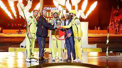 MS Dhoni receives IPL 2023 trophy alongside Ravindra Jadeja and Ambati Rayudu: एमएस धोनीच्या नेतृत्वातील चेन्नई सुपर किंग्सने सोमवारी मध्यरात्री इंडियन प्रीमियर लीग 2023 स्पर्धेचे विजेतेपद जिंकले. पावसामुळे रविवारीऐवजी राखीव दिवशी म्हणजेच सोमवारी पार पडलेल्या अंतिम सामन्याच चेन्नई सुपर किंग्सने गुजरात टायटन्सला पराभूत करत पाचव्यांदा विजेतेपद आपल्या नावावर केले.
