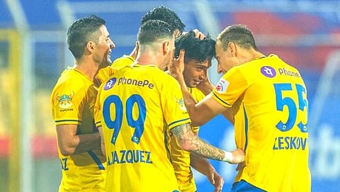 आयएसएल फुटबॉल स्पर्धेत रविवारी मुंबई सिटीविरुद्ध गोल केल्यानंतर आनंद व्यक्त करताना केरळा ब्लास्टर्सचे खेळाडू.