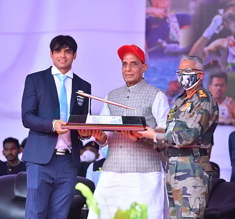 संरक्षण मंत्री राजनाथ सिंग यांनी आज पुणे येथे लष्कराच्या क्रीडा संस्थेस भेट दिली त्यावेळी ऑलम्पिक (Tokyo Olympics 2020) मध्ये देशाचे प्रतिनिधित्व करणाऱ्या सोळा खेळाडूंचा गौरव करण्यात आला. लष्कराच्या या क्रीडा मैदानाचे नीरज चोप्रा (Neeraj Chopra) स्टेडियम असे नामकरणही करण्यात आले.