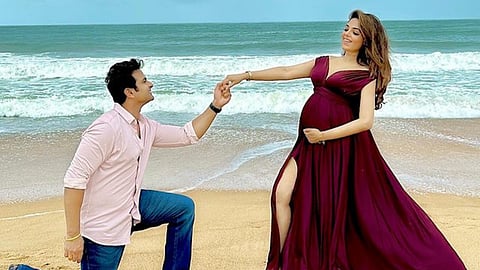 फोटोंमध्ये सुगंधा मिश्रा मरून रंगाच्या स्लिट गाऊनमध्ये तिचा बेबी बंप फ्लॉंट करताना दिसत आहे. तर संकेत गुलाबी शर्ट आणि डेनिम जीन्समध्ये दिसत आहे.