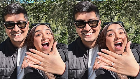 सेल्फीमध्ये प्राजक्ताने तिची अंगठी दाखवली जेव्हा तिने वृषांकसोबत हिरव्यागार वातावरणात पोज दिली.